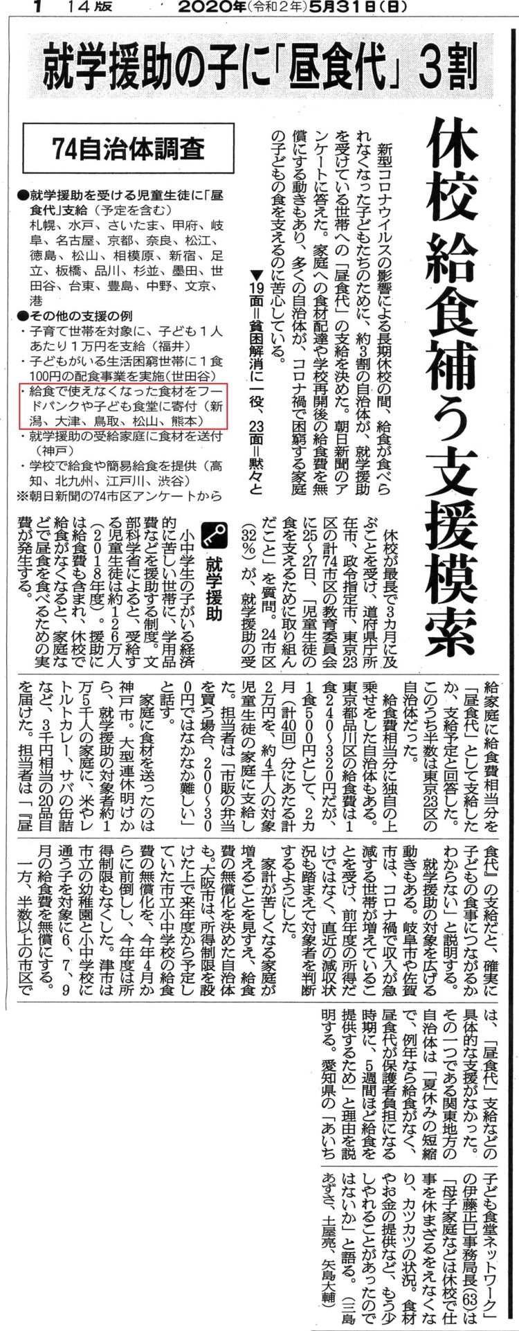 給食食材をフードバンクに出している自治体事例など(朝日5/31)