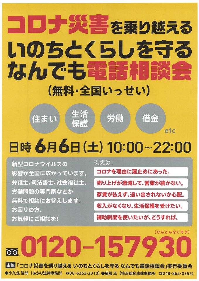 全国一斉6/6「コロナ災害を乗り越える-いのちとくらしを守る なんでも電話相談会・第2弾」(フリーダイヤル)のお知らせ(拡散のお願い)-埼玉総合法律事務所オフィシャルサイト