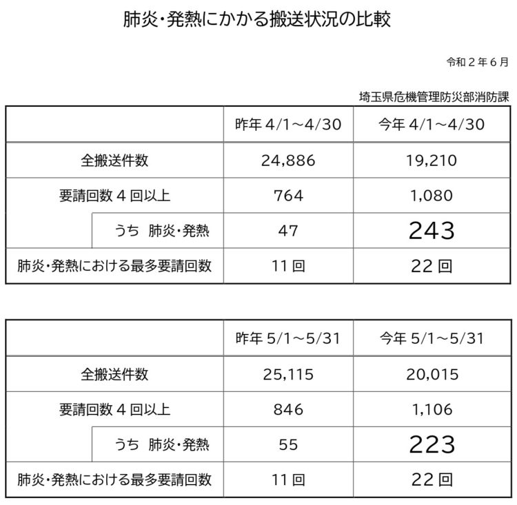 コロナ患者全体数は今年5月は減って来ている中での救急搬送の4月・5月の比較なので、この表を見ただけで、発熱・肺炎・コロナの可能性のある患者さんや病院にとっては、依然として厳しい・大変な状況が続いている事が分かります。県庁からは発表しておりませんので、私からお伝えします。