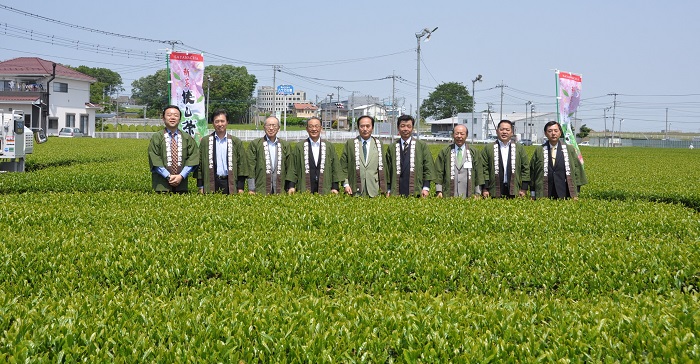 写真では知事のスーツは緑色に見えませんが、狭山茶の視察の際には、緑のスーツを着ています。