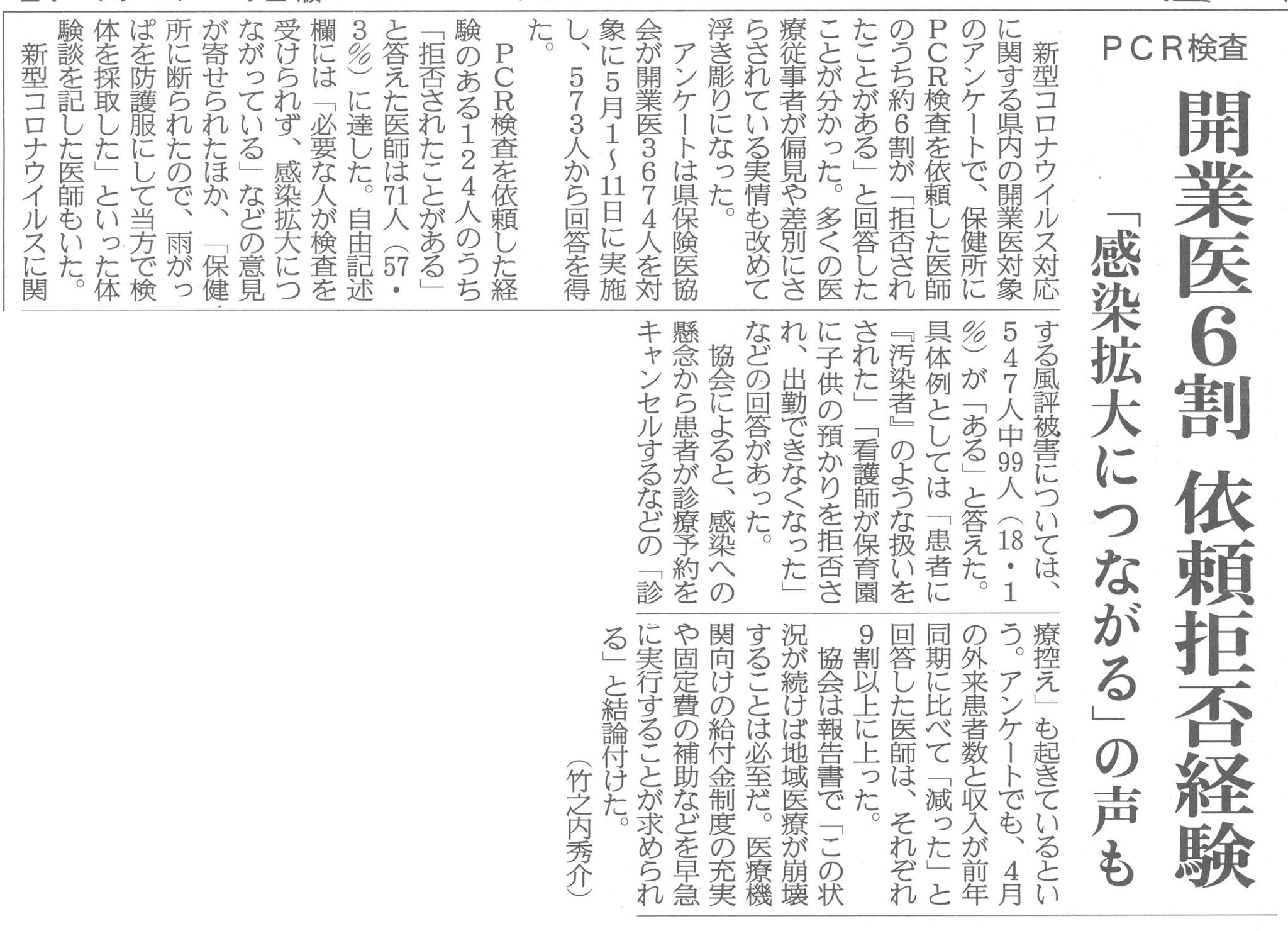 「保健所にPCR検査を拒否された事のある県内病院は6割」との県内医療団体の6月10日の報道