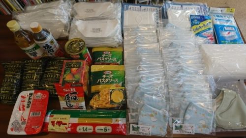 ひろし事務所でお預かりした食料品・マスクです。26日に必要な子育て家庭の手に渡ります。
