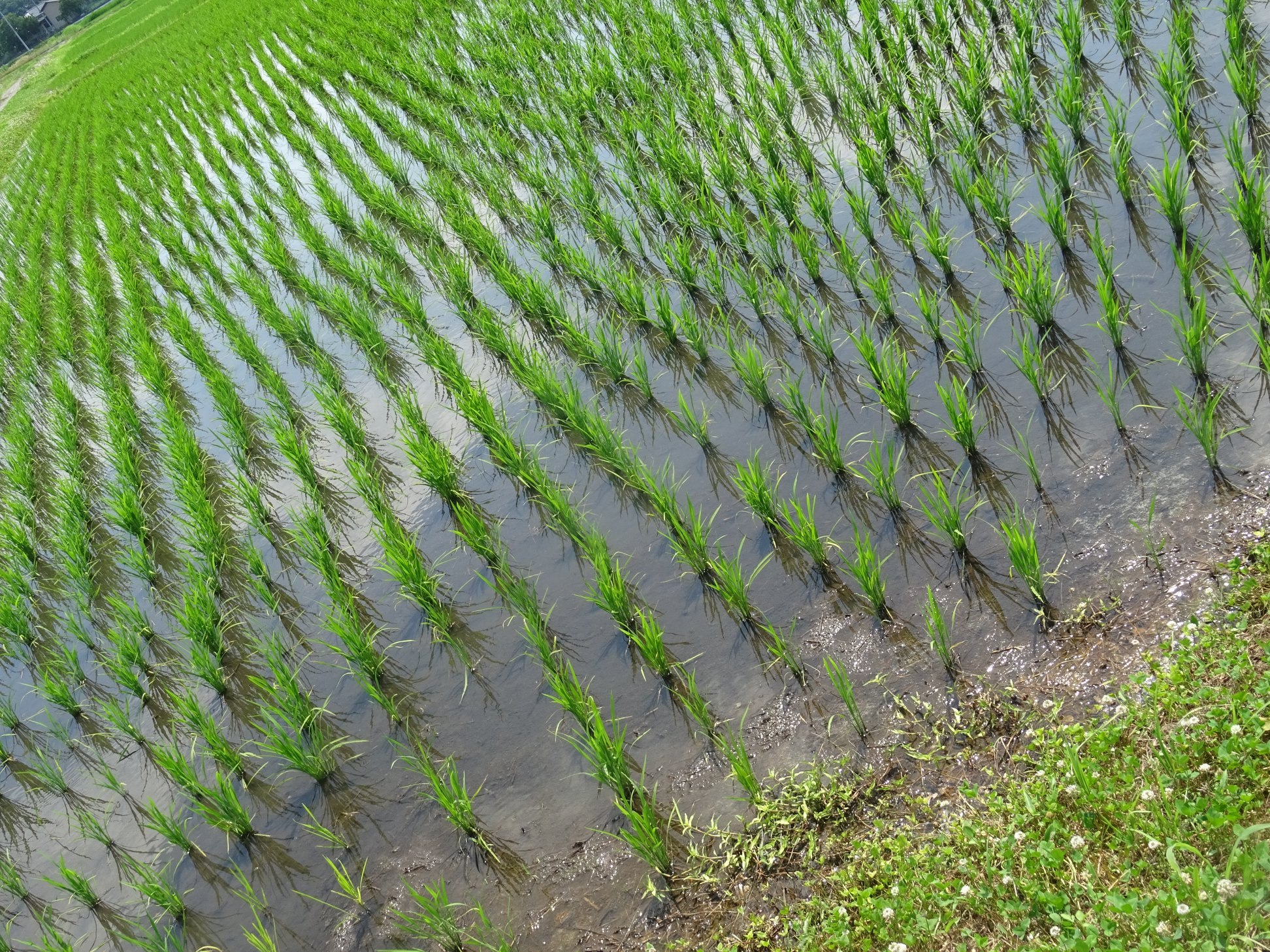 稲を植えたばかりの田んぼは、稲がまだ育つ前なので隙間があって、田んぼの水に