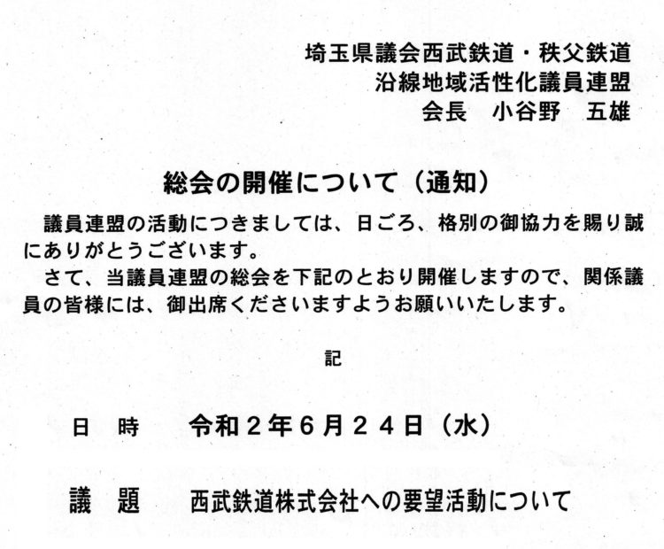 【西武鉄道🚈】についての県議会 沿線活性化議員連盟の会議が、明日(水)行われ、西武鉄道への要望活動を進めていくにあたり、中心的に動いている中野(川越)・内沼(飯能)県議に事前に相談し(感謝☺)、狭山市役所とも連絡を取りました。