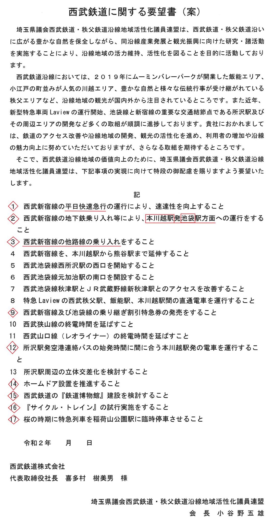 【西武鉄道🚈】県議会 沿線活性化議員連盟で、西武鉄道へ今後要望していく17項目が⬇以下の通り、今日決まりました。
