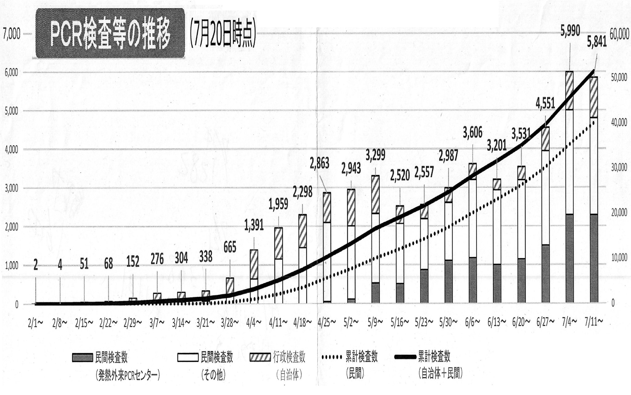 1日の可能最大数は現在、1600件だが、県庁としては今後3400件を目指したい。これまでの検査実績の最大は、7月21日の1368件(うち民間1131件)。