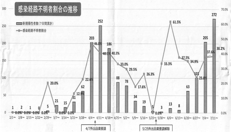 感染経路不明者数が本来、急激に5割(46.8%。4月4日)に跳ね上がったりは、しない。