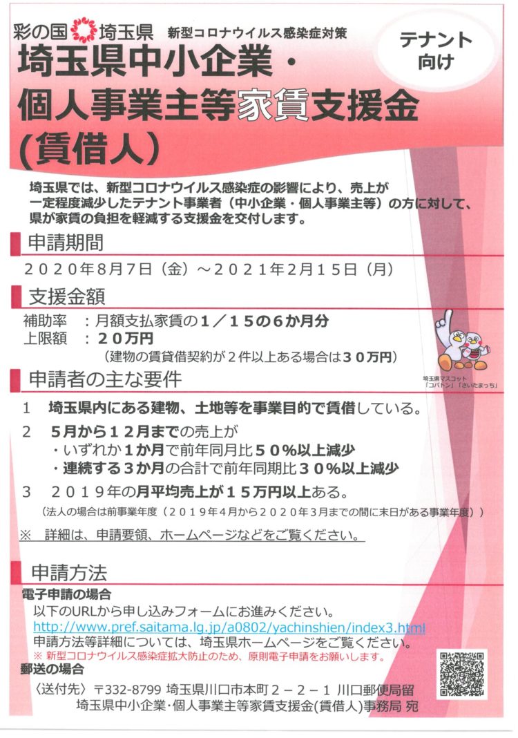 埼玉県中小企業・個人事業主等家賃支援金(賃借人)の申請受付を開始します。-埼玉県庁