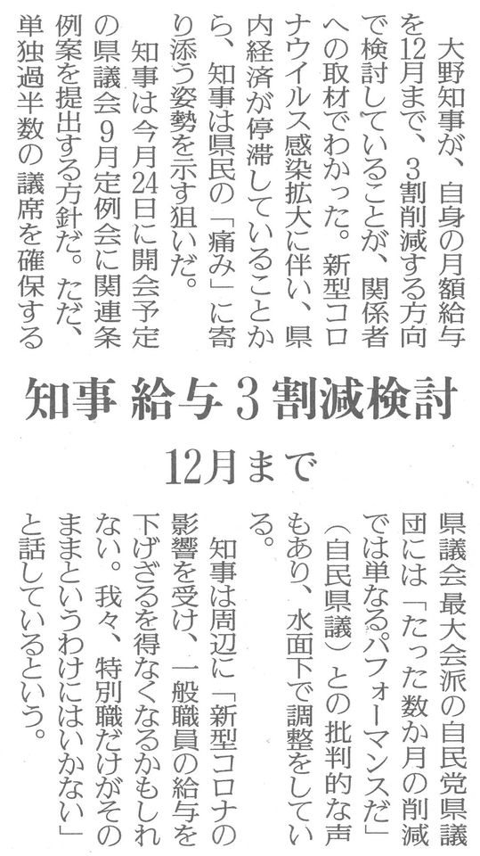 ⬇記事に書かれている知事の給与減額期間を「12月まで」としているのは、12月には給与がどうあるべきか人事院から勧告が出されるので、12月に何割下げるかまた考えるという意味だと思います。そして、減額した分の税金が、コロナ経済対策に使われる事が分かりやすくなっていればいいと思います。↓ この報道は、県庁幹部が発表したものではなく、情報が漏れたようです。  (詳しい事は来週お伝えします。記事は、読売新聞)
