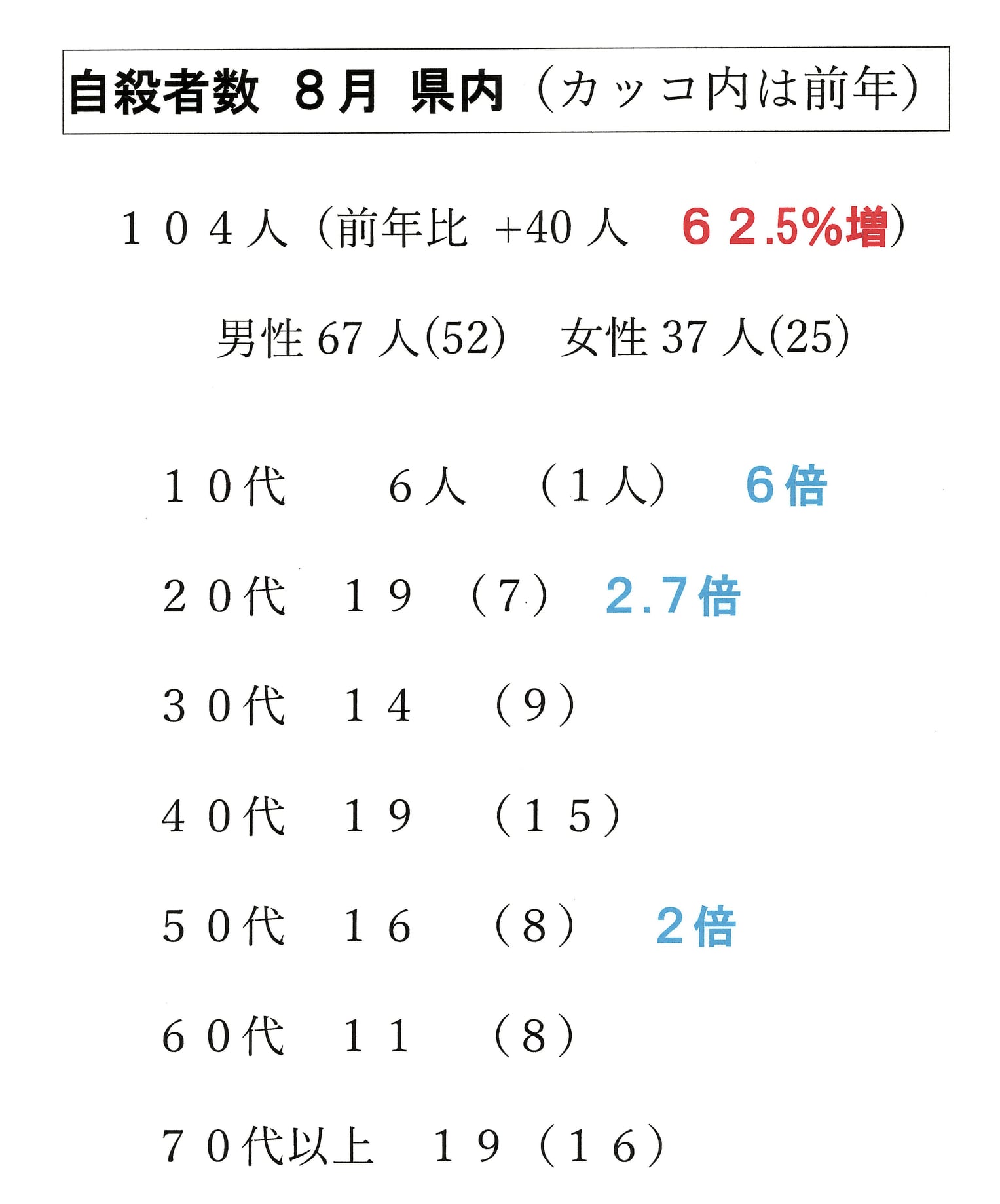 県内の今年7月までの自殺者数(613人)は、昨年同時期より少なかったのですが、災害が起きている時は、自殺は一時的に減り、一息ついてから急増する事があり、今年2月の段階から「コロナの根本的な感染症対策に取り組み、経済対策にも力を入れなければ、『経済的な死者』数が増えてしまう」と思って、取り組んで来ました。