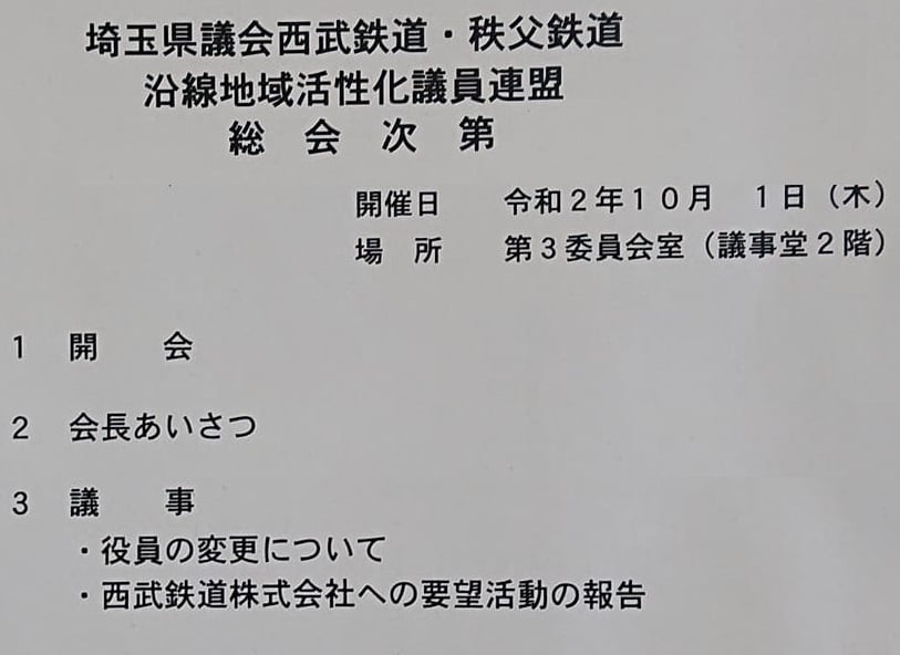 西武鉄道 沿線活性化 県議会議員連盟】の会議があり、西武鉄道の幹部の方に議員連盟が要望に行き、先日皆さんにお伝えした『西武新宿線