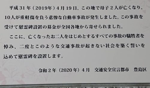交通事故ゼロの未来へ「希望の芽」 池袋暴走事故、現場近くに慰霊碑ー東京新聞