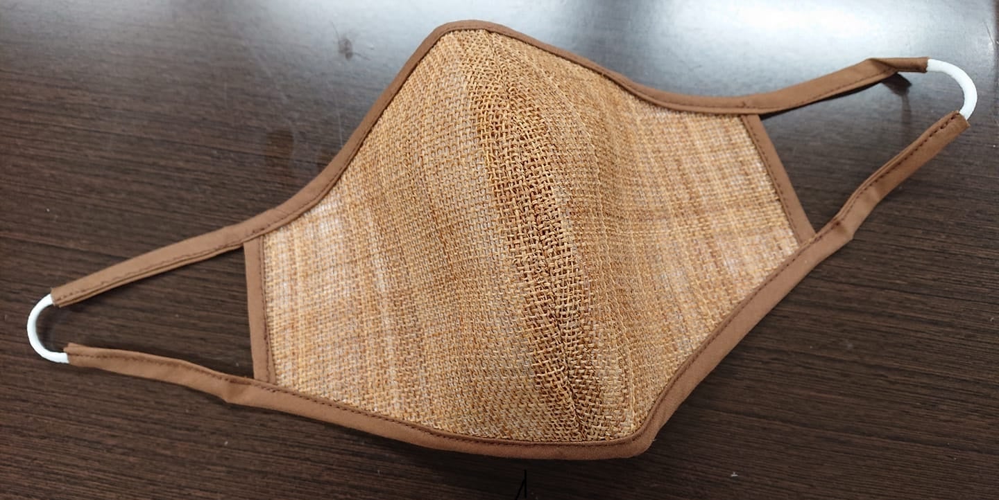しな布は、とても軽く・丈夫で、水・熱にも強い。木そのものの色のまま、色分けしながら、全て手作業で糸を作り、織り上がるまでに1年かかり、ボーダー柄にした生地。マスクは、ほのかに🌲木の香りがします(📷現物は、もっと明るい色)。手入れは、普段の中性洗剤で手洗いとの事。
