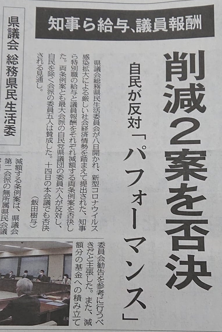 県議会でも明日(水)、知事と県議の『報酬削減』案が否決され、その状態になる。相手を悪者にして、自分の支持を上げればいいという程、『コロナ禍経済』の中にある県民の実情は甘いものではない。