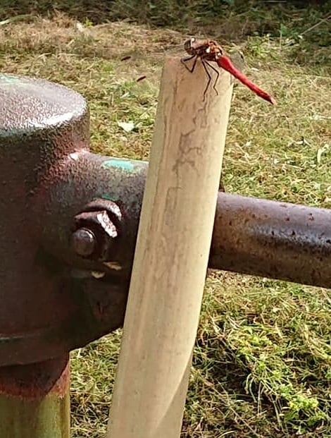 (草刈り作業中に、ご相談の電話が入り、熊手を置いた時に、トンボが止まりました)