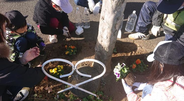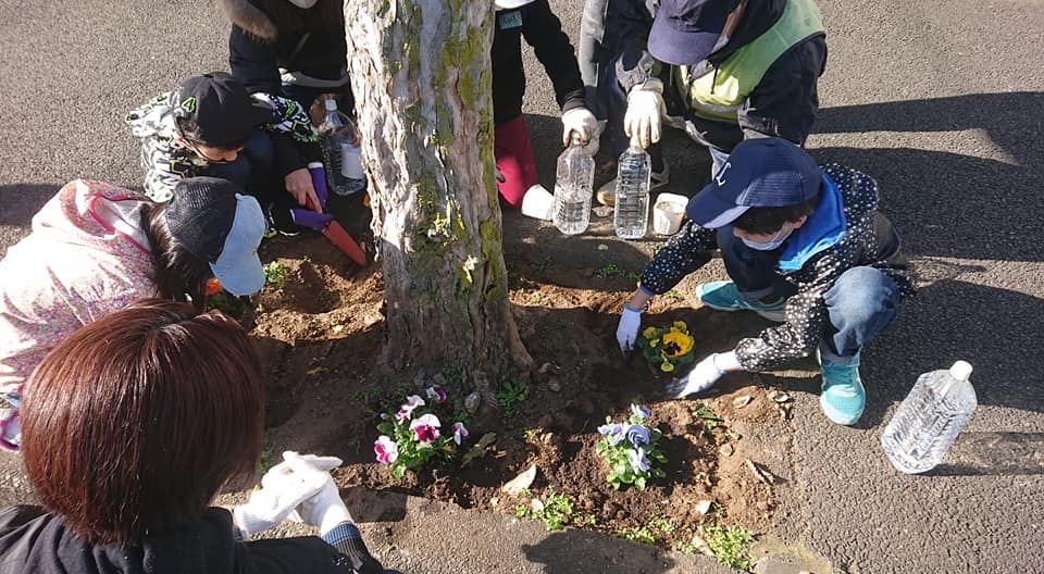 👧子ども会👦と、自治会の緑化グループによる初めての歩道への🌺花植えが行われ、参加しました。