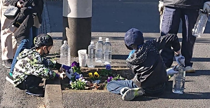 子ども達が🌺花植えするのに、自治会の方は、先回りして、花の水のペットボトルを配置。