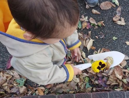 自治会の方が、ちっちゃい子に、🌺花びらをプレゼント。スコップの上に載せてくれました。