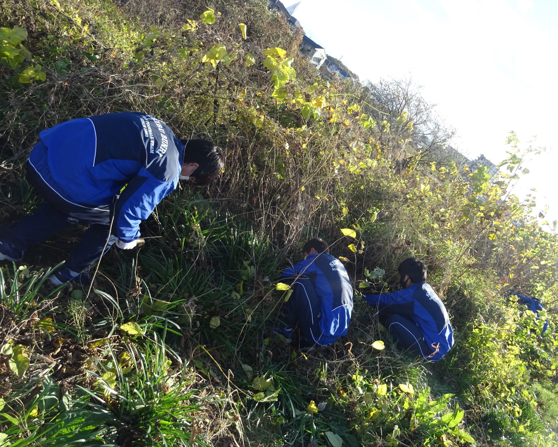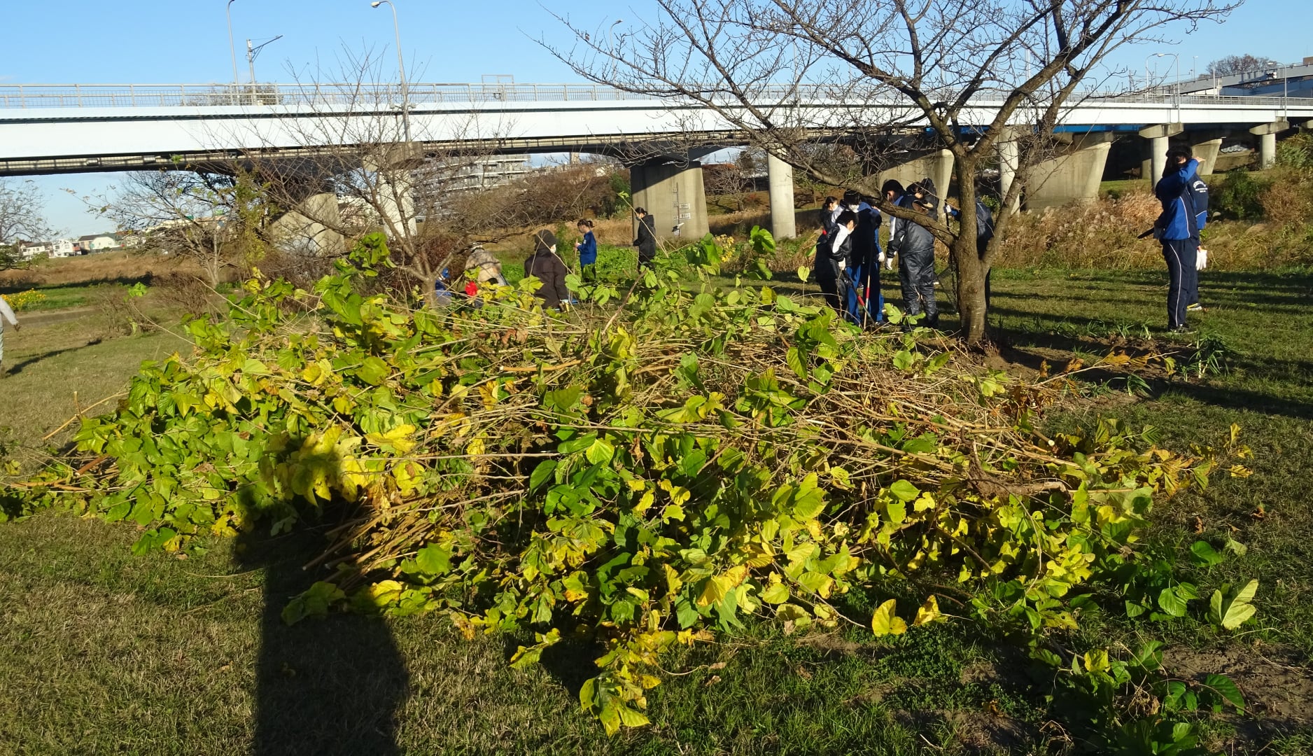 私は、河川敷のやぶの中に入り、桑の木をひたすら切って、文理高校の生徒さんに切った木を運んでもらいました。