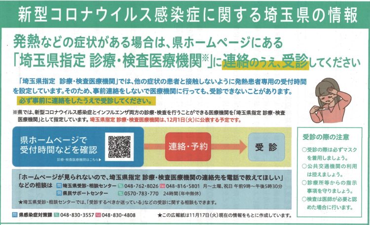 公表する発熱外来は、県内の発熱患者の診察をしている約2400の病院の約半数で、公表になる発熱外来まで行けない方は、発熱の際、これまでかかったお近くの病院に電話してみて下さい。コロナの相談電話である県民サポートセンター(☏0570-783-770 24時間年中無休)や受診相談センターは、お住まいの近くの公表される『発熱外来』のみを紹介するものです。