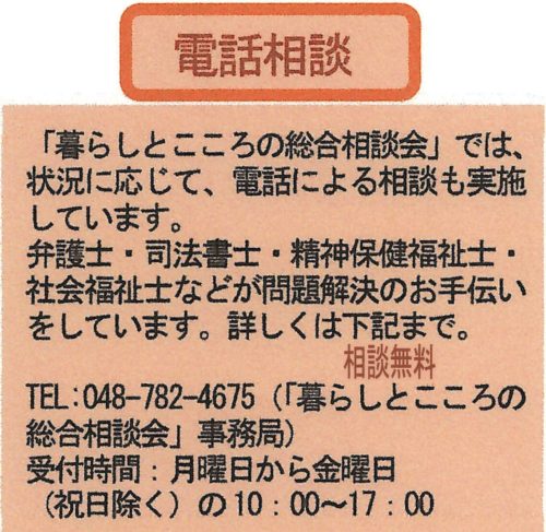 『生活面・こころの健康・失業・借金・職場トラブル・ひきこもり等』の悩みについて、「相談会には行けなくても電話なら」という方も多数いらっしゃると思います。