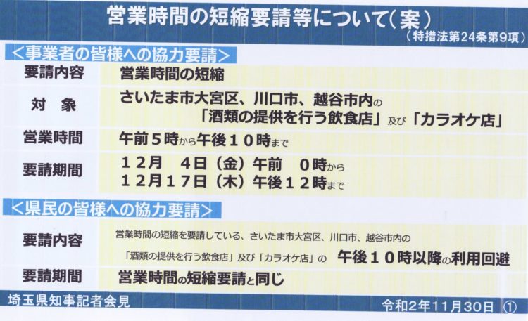埼玉県は、過去にクラスター(集団感染)が発生した繁華街のある【さいたま市大宮区・川口市・越谷市】のお酒を提供する飲食店とカラオケ店を対象に、営業時間を午後10時までに短縮して下さるよう協力要請し、応じた店舗には28万円の協力金を支給する方向との事。期間は12月4日午前0時~17日までの14日間。