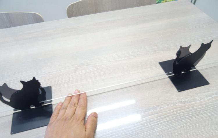 『東雲会』面談室のアクリル板は、100円ショップ(📷ネコの)を活用した手作り。なんで手を出しているかというと、この すき間で書類のやり取りが出来るそうです。