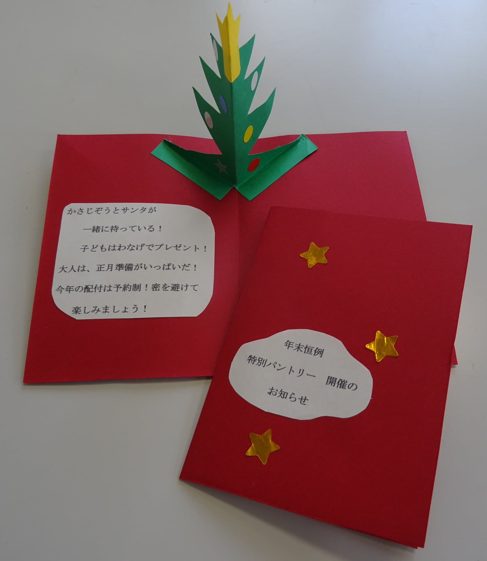 食品を渡すだけでなく、単にコピー用紙でなく、お伝えしたい事を、ボランティアさんが色紙を使って、🎄クリスマスカード風に作りました☺。