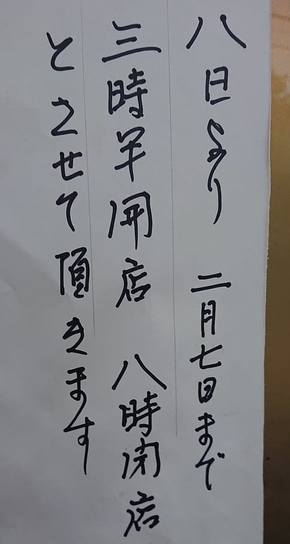 飲食店からのお話「うちは明日(日)から2月7日まで休むけど、従業員のパートさんにも給料は出す」「雇用調整助成金の1人分の申請作業だけでも1・2日かかってしまう」「フランチャイズのうち、数店を閉店にした(※)」「12日以降、夜8時にシャッターを閉めてお客さんが入ったままにしようとしているお店があるので、きちんと守るべき。行政でパトロールして欲しい」「『協力金160万円は、普段そんなに儲けてないのに、もらい過ぎでは?』とお客様に言われた」「『ライトダウン』と言われているが、夜8時以降テイクアウトの営業形態で店の外を暗くしないといけないのか?基準が分からない」「時短要請は8日からかと思って、(📷写真)貼った」。