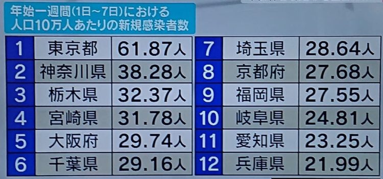 東京の今日の陽性者数は2268人で、12月下旬から既に暴走している(埼玉は今日 518で、残念ながら今後、東京都に引きずられていく)。