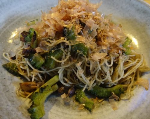 に渡す時、「焼きそばのように炒めると、おいしいですよ」と話します(醤油・塩)。私は、ソーミン・チャンプルが好きで、初めて沖縄で食べた時、これを思いついた人は考えたな と思いました。もちろん、ゴーヤーが苦手な方は入れなくても。