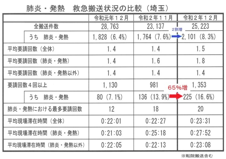 前年同月比、救急搬送全体が13%減の中、(発熱以外を含めた患者の)受け入れ要請を4回以上行った回数が2割増で、救急病院がひっ迫している事や、発熱・肺炎患者数自体は、前月比2割増えただけなのに、4回以上要請した件数が65%増えており、コロナ病床のひっ迫が急激なのが、分かります。