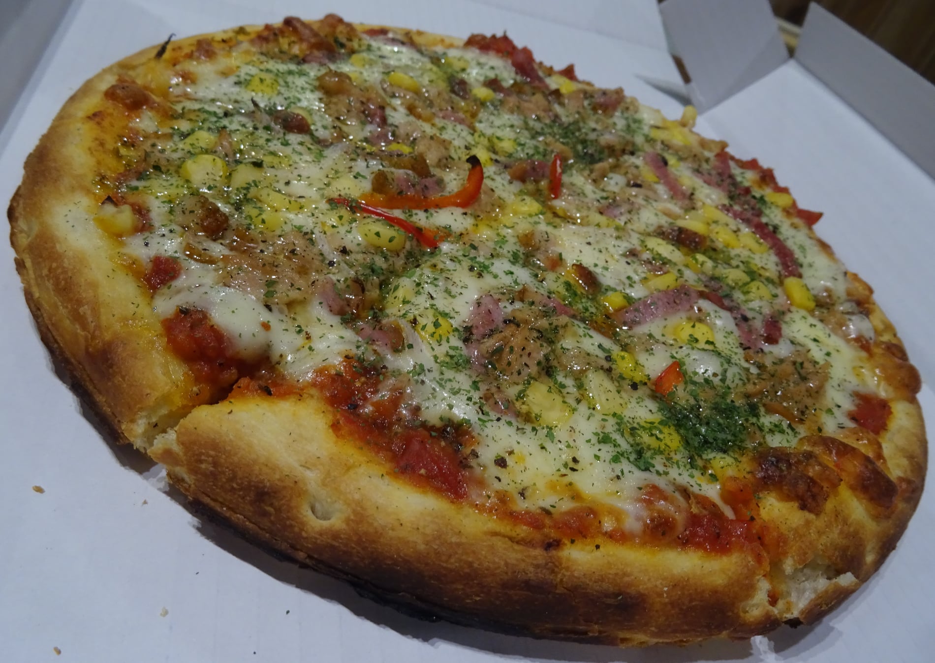 テイクアウトで私のおススメは『🍕ピザ』。分厚くて、おいし~😆(📷写真はミックスピザ)