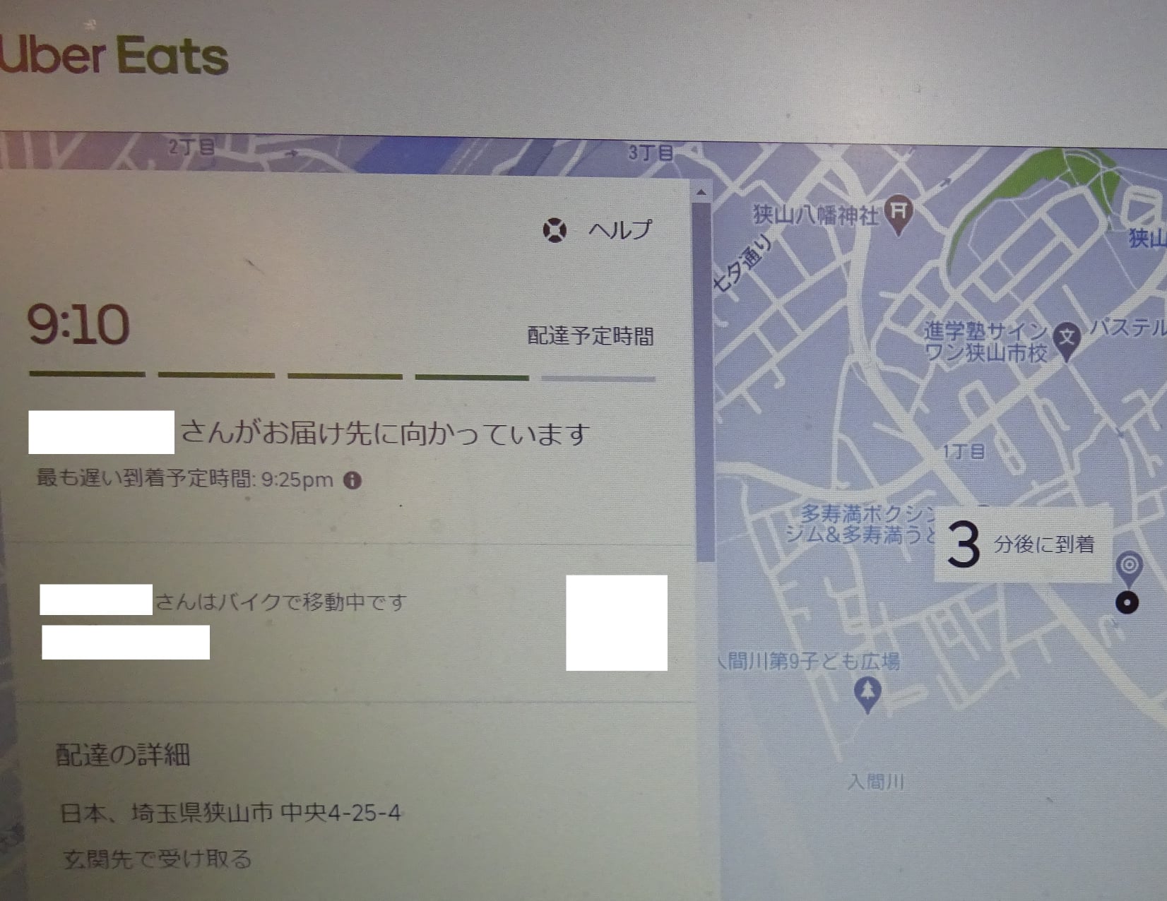 配達員さんが確定し、名前・顔写真・🏍ナンバーが表示され、地図に今🏍いる場所も表示されます。