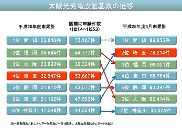 ・住宅用太陽光発電設置数、現在、1位は愛知県(10万7千基)で、その差は2万3千基。1位を目指しているというアピールが県民に向けて必要ではないか?