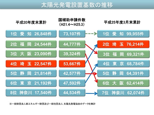 (太陽光発電設置の伸び率(5年前比)を自分で計算してみたら、1位愛知3.72倍、2位神奈川3.54倍、埼玉は3位3.38、4位東京3.25という状況だった。伸び率が上がるようにしなければ)