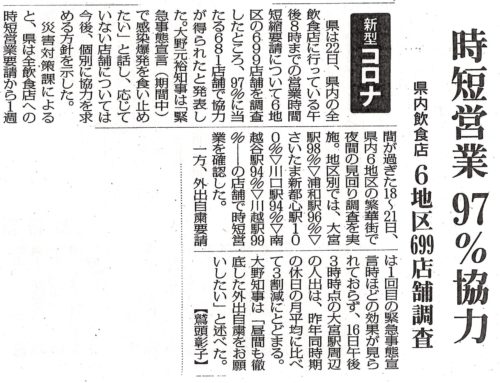 従業員の給料を払いたいと思っているものの、『雇用調整助成金』制度をご存知ない飲食店は、市内にもあるので、私から県庁に提案し、飲食店に時短へのご協力のお願いの①電話をする際、時短出来ない理由を聞く事、②雇用調整助成金の県庁の相談窓口を掲載したチラシの郵送 が実現されておりますが、『休業支援金』相談の対応が漏れていたので、私から再度提案しています。