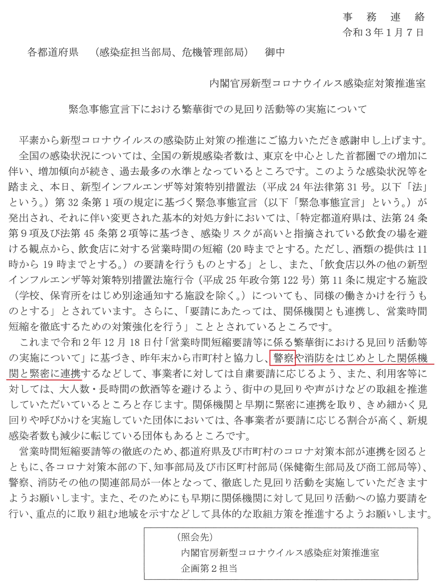 飲食店『時短協力要請』に【警察】権力を県庁は使う気? 続報 知事が言っていた⇩これが「国から警察と協力体制を組むよう要請があった」という文書。でも、読んでみると、警察を使うようにとは書いてない。そこで、担当職員と話した結果「警察官を動員する事は、検討していない」との事。そういう事なら、県庁からそのように発信してくれればと思うのですが。 災害時は、丁寧な説明が、より必要。でも県庁の体制が改善出来ていない。