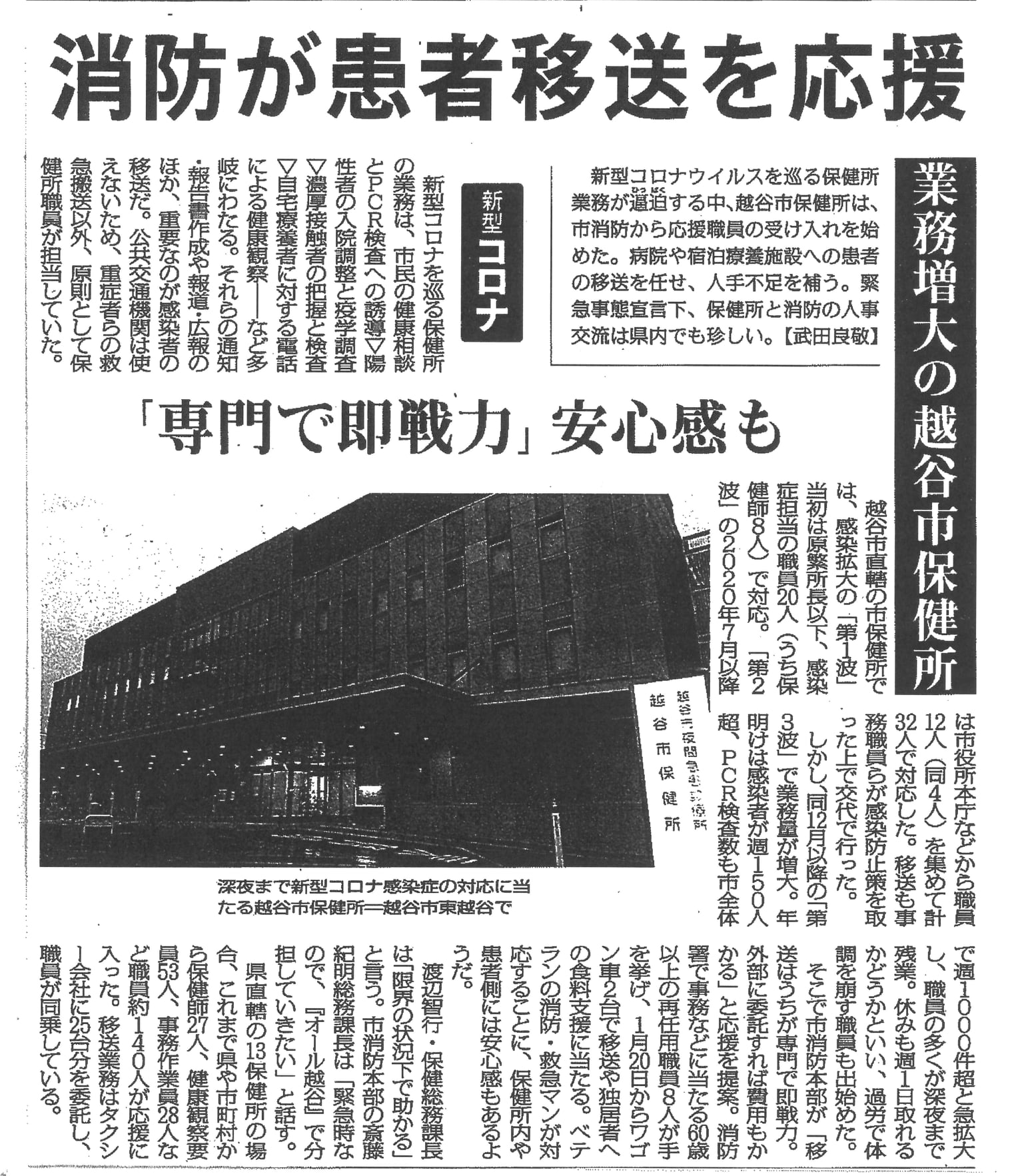 消防署だけでなく、人口の多い市は、市で保健所も持っています(業界用語:政令市)。越谷市に聞いたところ、🚑救急隊の経験のある消防署員OB 8人を保健所に既に20日から派遣し、コロナ患者の移送を一手に引き受け(重症の場合のみ救急車)、コロナ自宅療養者の食料配達業務にもあたっているとの事。「救急経験があるので、保健所として心強い」とおもっしゃっていました。