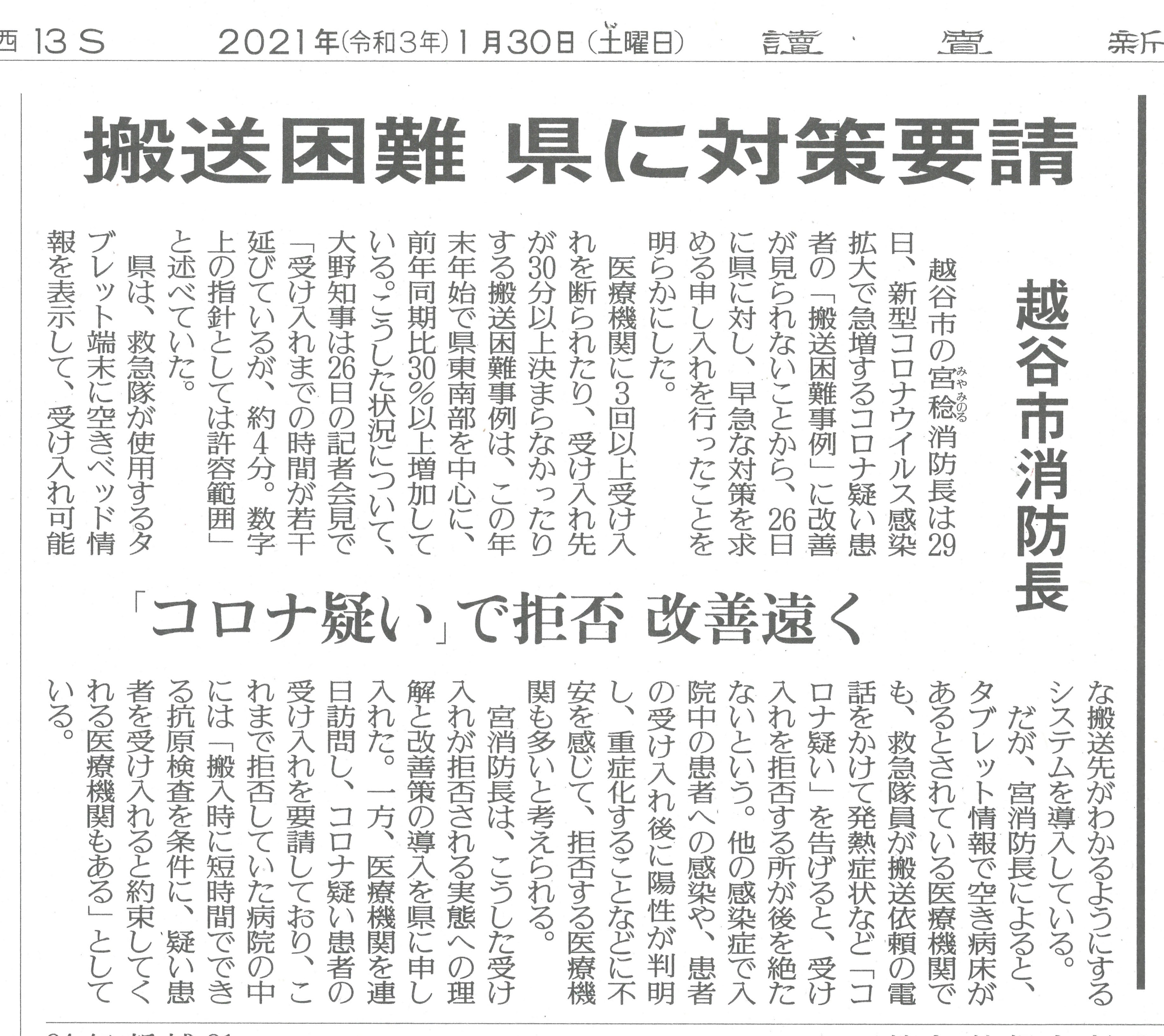 29日(金)の読売新聞に「消防職員が協力を申し入れた」とあり、県庁はよく「連携」を口にはしますが、「要請があれば」ではない”積極的”連携がコロナ禍の非常時に取れていると思います。他市に推進しないと、保健所職員が倒れてしまうし、救えない県民が出てしまう。