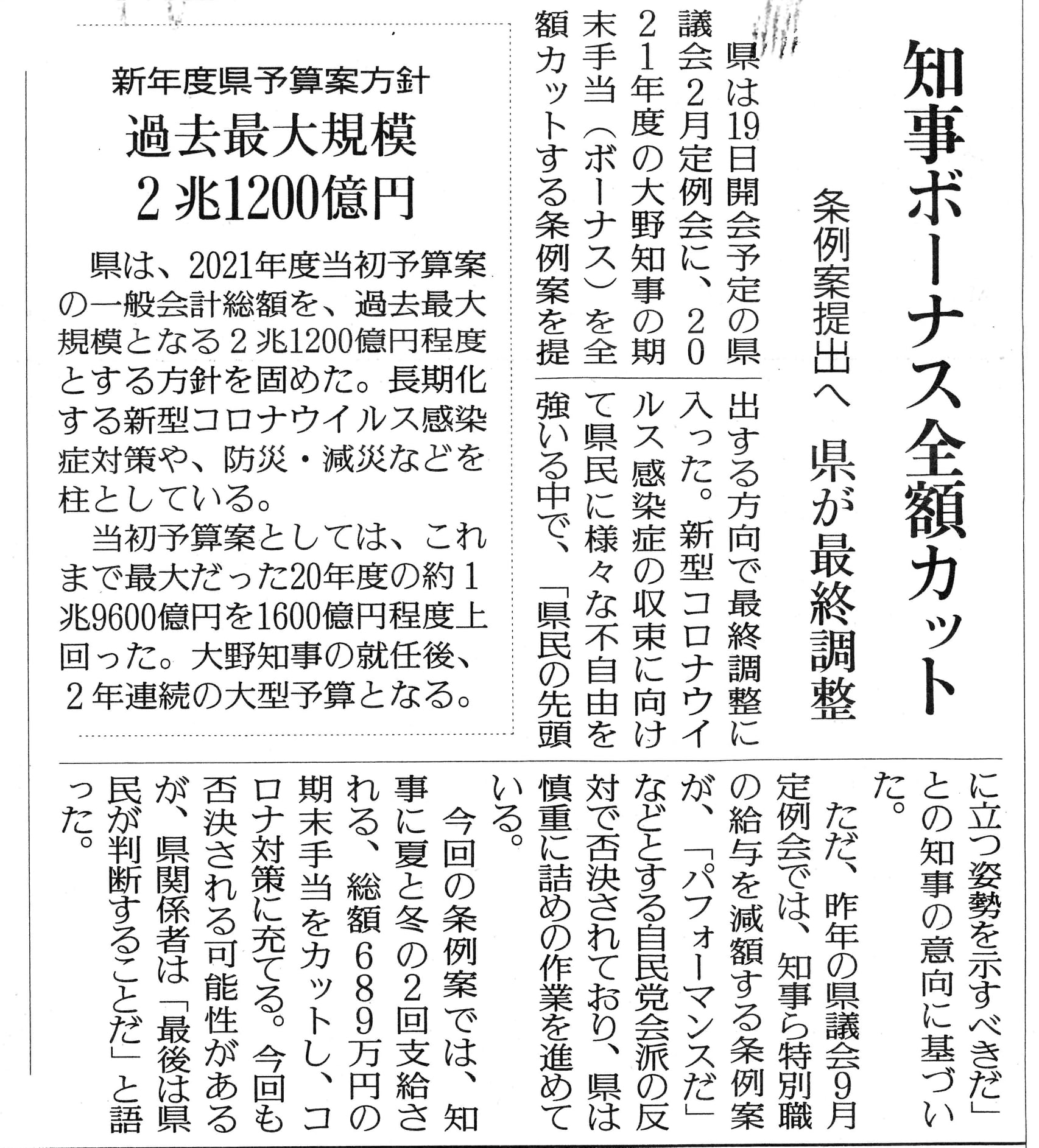 【大野知事 ボーナス全額カット案】 県議会も ぜひ全額カットを![]()