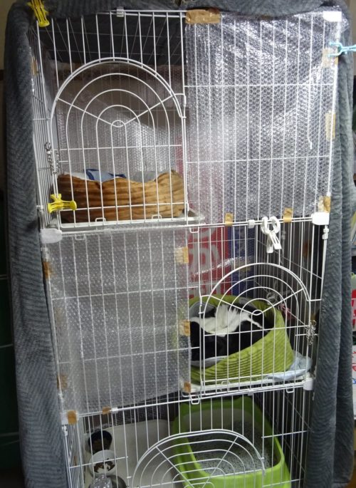 ネコが寒くないように、ボランティアさん3人掛かりで、『プチプチ』でゲージの手前も覆って下さいました。