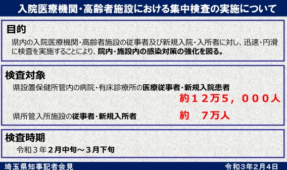 介護(入所)施設職員の県庁の『集中検査』は、当初 狭山市を含まない12市のみが対象でしたが、職員に加え 新規施設入所者 全県1090か所7万人のPCR検査を行う(さいたま・川口・越谷・川越市にも働きかける)。