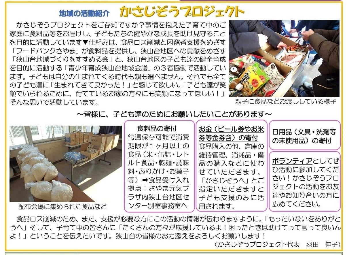 【フードバンク】(かさじぞうプロジェクト)について、狭山台公民館の2月号の『公民館だより』(全世帯配布)に掲載してくれた(