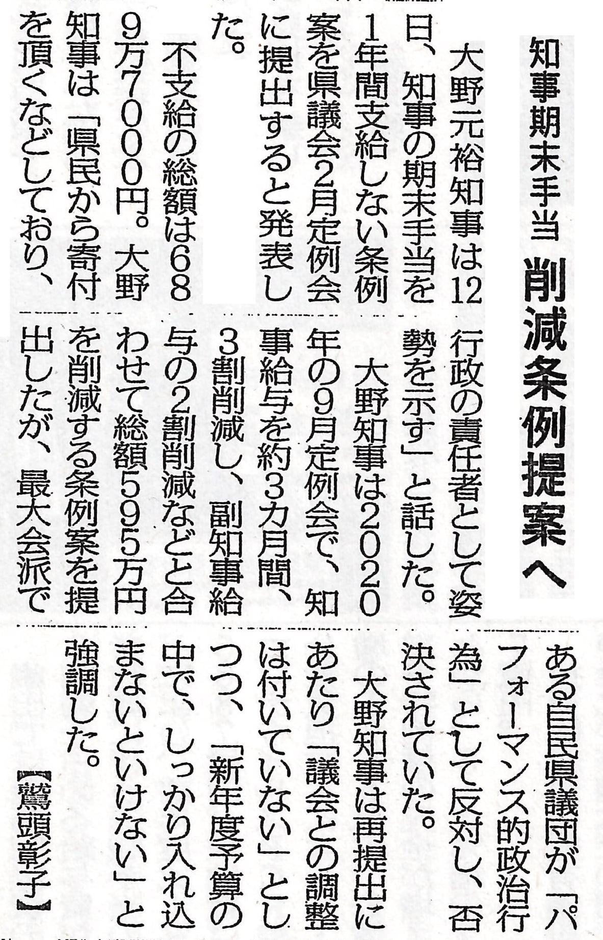 【県知事のボーナス全額カット】案に賛成する県議は「当然、自分の分も」となるのではないか。でないと、人のお財布のお金の減額にだけ賛成となってしまう。