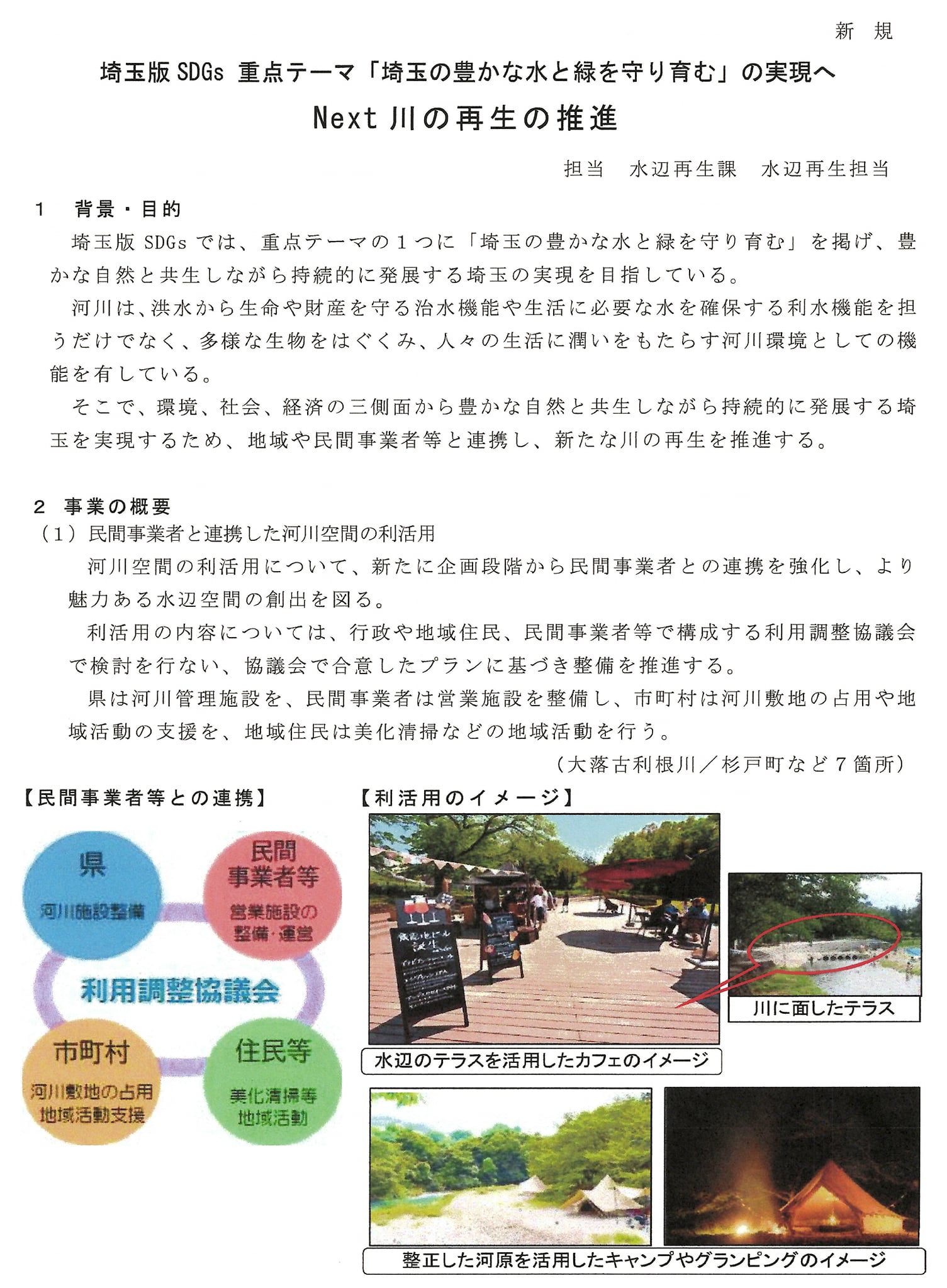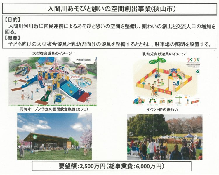 市の真ん中に川が流れる珍しい街の狭山市に、県庁として、これまで河川敷の利活用を呼びかけ、県の補助金2500万円で市が大型遊具などを整備(3月16日に利用開始)。
