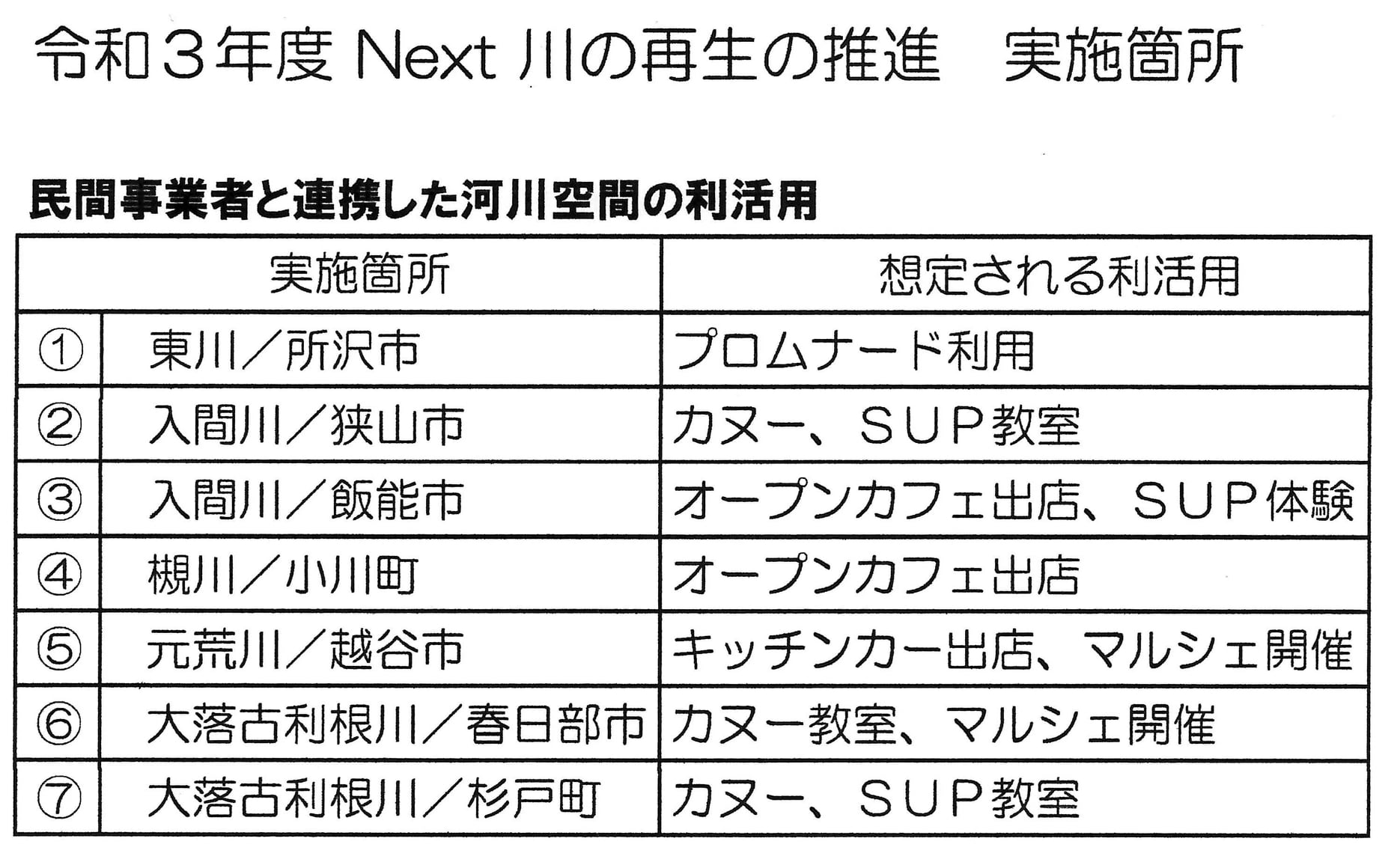 カヌーの船着き場の整備は、まだ市としての予定が無く、今後、河川敷の“線”での利活用を連携して取り組み、経済効果を得て行きたい。