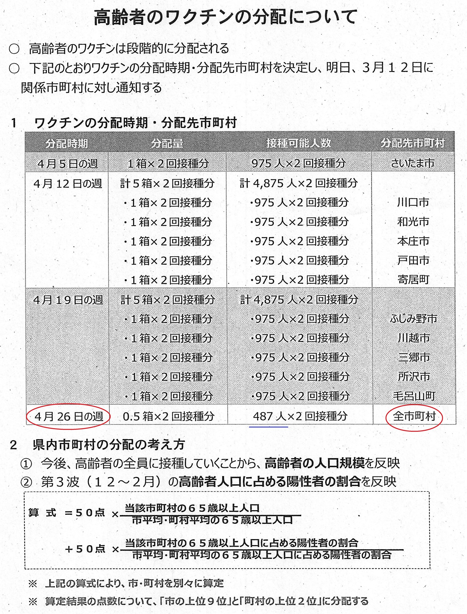 ワクチン 埼玉県内 全市町村 【配布開始は、4月26日の週】『高齢者分』