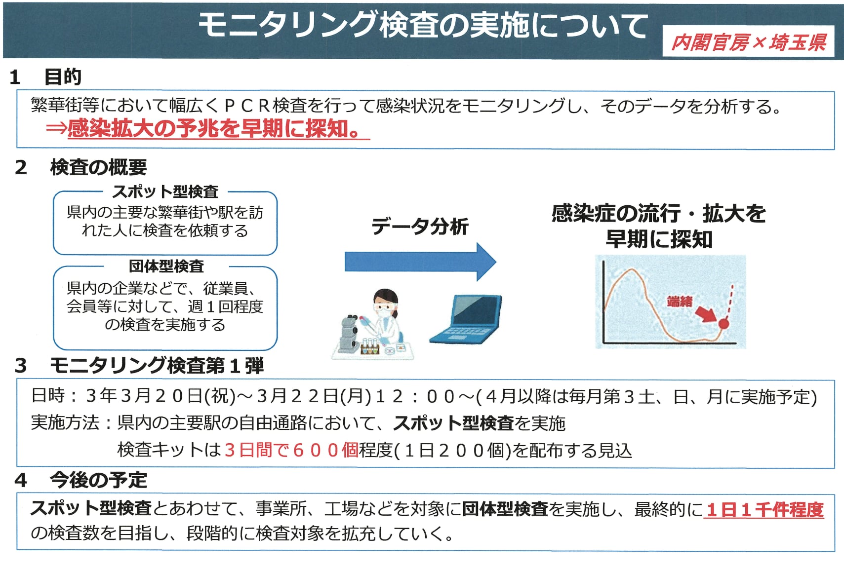 あす20日㈯から主要駅自由通路(さいたま新都心駅など)で3日間『モニタリング検査』を合計600人分 行う。繁華街の感染状況・傾向を把握する為、今後も定期的に行う(最終的に1日千件規模)。