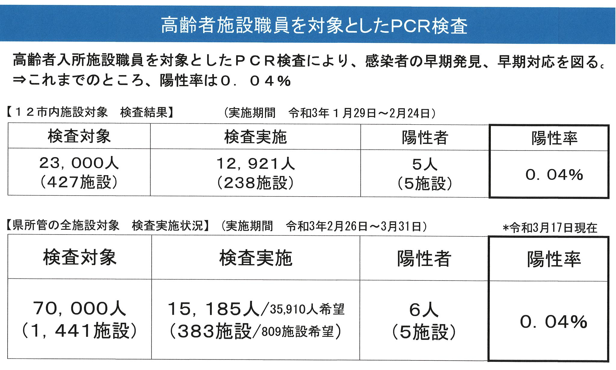 県内7万人の高齢者施設職員の22%が現在検査済み(17日現在)。検査に協力して下さる施設は全体の56%(検査に応じた施設の検査済み率は42%)。